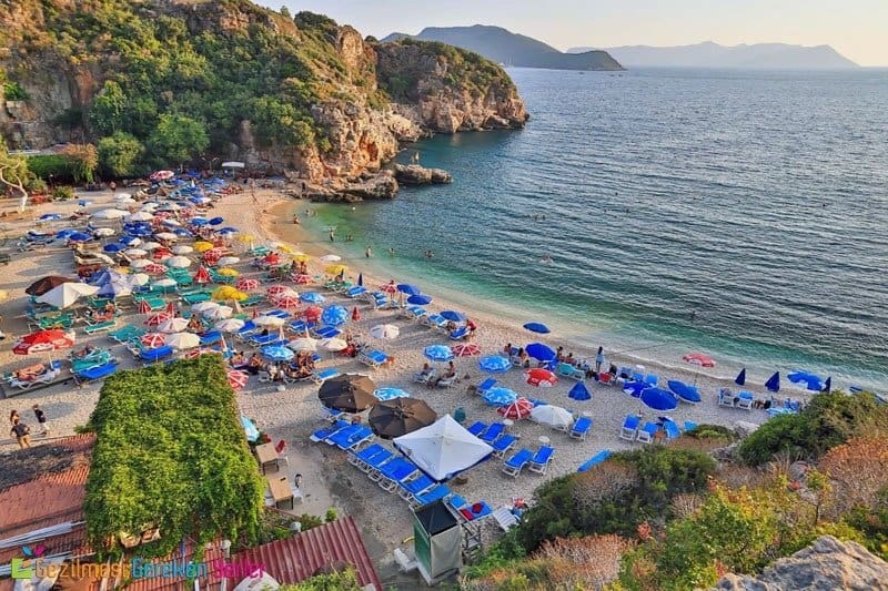 Plaj, Kaş tanıtım panolarının üzerinde mutlaka yer verilen bir mekan olmasından da anlaşıldığı gibi, buraya geldiğinizde görmeden dönmemeniz gereken yerlerin başında geliyor. Demre yolundan giderken, anayol üzerine arabanızı bırakıp epeyce merdiven basamakları indikten sonra bu cennet mekana ulaşıyorsunuz. Kuşbakışı görüntüsü ile zaten büyülenmiş olarak geldiğiniz plajı yakından görünce hayranlığınız daha da artacaktır.